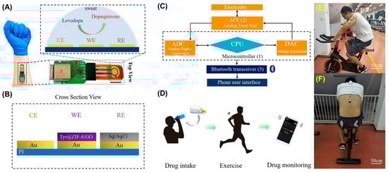 (A) Photograph of wearable LD sensor and its electrochemical sensing of LD. (B) Graphical representation of various components of the three-electrode system. (C) Block diagram of the potentiostat. (D–F) Real-time application of the fabricated LD sensor. Reproduced with permission from [77].