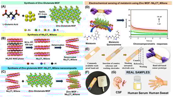 (A) Graphical representation for the synthesis of (A) zinc–glutamate MOF, (B) MXene, and (C) MOF-MXene nanocomposite. (D) Electrochemical sensing of melatonin and its amperometric response. (E) Scheme for the fabrication of band-aid based prototype melatonin sensor. (F) Photograph of prototype sensor connected to the portable potentiostat. (G) Various real samples analyzed. Reproduced with permission from [80].