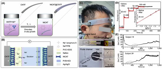 (A) Scheme for the synthesis of MOF@CNTF and (B) electrochemical cell. (C) Photograph of a volunteer wearing the band-based wearable sensor and its components. (D) Potential response and (E) real-time sweat sodium concentrations of two subjects obtained using the wearable sensor. Reproduced with permission from [85].