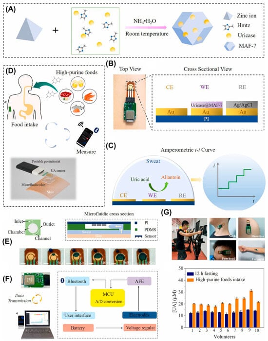 Uric acid (UA) is a critical biomarker for various physiological and pathological conditions, making its detection and monitoring essential in clinical diagnostics, healthcare, and wellness management. Xiao and colleagues developed a wearable, sweat-based UA sensor using uricase encapsulated within a hydrophilic zinc MOF (UC@MAF-7) [86]. During the synthesis of MAF-7, uricase was encapsulated within the MOF structure, which helped preserve the native structure of the uricase under harsh conditions and enhanced its enzymatic activity. The sensor was constructed by drop-coating the synthesized UC@MAF-7 onto a screen-printed gold three-electrode setup. Initially, the sensor’s applicability was evaluated in artificial sweat and later extended to human sweat analysis. This sensor demonstrated a linear detection range of 2–70 µM with an LOD of 0.34 µM for UA detection. For human subject analysis, the sensor was attached to a flexible microfluidic channel placed on the skin of the subject. The microfluidic channel effectively collected the sweat and delivered it to the sensor surface. A portable potentiostat attached to the sensor performed the measurements and displayed the quantification data on a smartphone screen. The sensor fabrication, sensing mechanism, various components of the fabricated sensor, and human trials are shown in Figure 11.