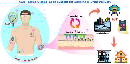 Graphical illustration of proposed closed-loop sensing and drug delivery system using MOF-based electrochemical sensors. (A part of this image was designed using icons from www.flaticon.com, accessed on 25 August 2024).