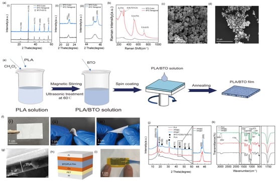 (a(i)) XRD spectra of BTO cubic and BTO tetragonal; (a(ii)) partial enlargement of the XRD spectrum at 22–24°; (a(iii)) 44–46° partial enlargement of the XRD spectrum; (b) Raman spectrum of BTO cubic and BTO tetragonal; corresponding SEM images of the (c) BTO cubic, (d) BTO tetragonal; (e) production process of piezoelectric composite film; (f) optical images of the flexible film; (f(i)) overhead optical images of both (f(ii,iii))flexure; (g) SEM image of film thickness; (h) structural diagram of PPS; (i) optical diagram of PPS; (j) XRD spectra of the samples; (k) infrared spectra of the samples.