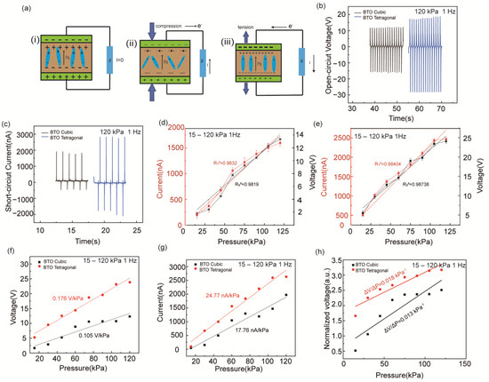 Piezoelectric effects can be divided into two types: positive piezoelectric effects and inverse piezoelectric effects. The positive piezoelectric effect refers to the deformation of piezoelectric crystal under the action of external force, resulting in the relative displacement between the positive and negative charge centers inside the crystal, resulting in polarization. In this process, an equivalent bound charge of the opposite sign will appear in a specific direction of the crystal, and its charge density is proportional to the external force applied. The basic mechanism of positive piezoelectric effects is shown in Figure 3e. Compared with BTO cubic, BTO tetragonal shows a higher aspect ratio, which makes the relative displacement between the positive and negative charge centers inside its crystal larger, resulting in a more significant polarization effect, generating more bound charges, and further improving the electrical output capacity of the PPSBT.
