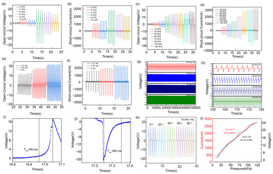 (a) VOC and (b) ISC of PPSBT at BTO concentrations of 0, 2, 4, 6, 8, and 10 ωt%; (c) VOC and (d) ISC of PPSBT (BT content of 6 ωt%) under different pressures; (e) VOCs and (f) ISCs driven by different frequencies; (g) durability tests of PPSBT under different operating frequencies (0~5000 s); (h) enlarged view of partial 100–140 s area data in (g); (i) response time of PPSBT under 75 Kpa; (j) recovery time of PPSBT under 75 Kpa; (k) power output capacity of PPSBT at different temperatures under 75 Kpa; (l) sensitivity of PPSBT.