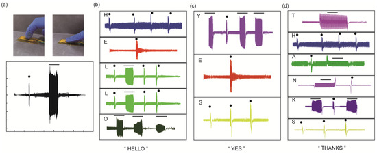 In addition, the application of flexible sensors in human–computer interaction systems is further studied. The PPSBT can generate a voltage signal when subjected to external force, and its output signal can remain relatively stable under the applied force state. As shown in Figure 6a, when the different force modes are applied, the force time of the PPSBT is controlled, and voltage signals of various shapes can be generated, such as “points” and “lines”. In standard International Morse code, dots and dashes in various permutations represent different letters of the alphabet. From this point of view, different sensing signals generated by different stress times can also be encoded accordingly. For example, as shown in Figure 6a, a short time of force will produce a voltage signal corresponding to the “point”, while a longer time of force will produce a voltage signal corresponding to the “line”. Therefore, by controlling the time of finger pressing, sensor signals with different waveforms can be generated, which represent the points and dashes in Morse code. The voltage signal output by the sensor can be convert into Morse code for information encryption and transmission. By rhythmic flexing and pausing of finger joints, the English words “HELLO”, “YES”, and “THANKS” are delivered, as shown in Figure 6b–d. The intelligent application of the PPSBT provides a new perspective for information transmission and intelligent interaction in the future.