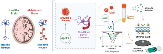 Schematic representation of the proposed methodology for detecting Alzheimer’s disease biomarkers. This study’s overarching concept involves quantifying amyloid plaques and ApoE4 in human blood samples, considering the disruption of the blood–brain barrier (BBB). Plasma is separated from whole blood and analyzed using SPCE devices to quantify low concentrations of Aβ42 and ApoE4. Specific antibodies are conjugated to the CNT-PEG-AuNS-modified working electrodes prior to the assays. A small volume of plasma is applied to the active area of the SPCE, and electrochemical analysis is conducted using the DPV technique, where peak currents correlate with target concentrations.
