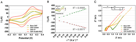 To assess the conductivity and stability of the sensing layer with an electrolyte (potassium ferricyanide (5 mM) and potassium chloride (0.1 M)), electrochemical analysis was conducted on the modified SPCE devices using CV. Anodic and cathodic peaks were recorded at each modification step of the working electrode. As illustrated in Figure 3A, the peak current increased following the doping of CNTs with thionyl chloride, while no significant change was observed after PEG treatment. This enhancement is attributed to the improved electrochemical performance of CNTs modified with thionyl chloride compared to CNT-COOH, which is due to a better electron transfer and conductivity. The introduction of acyl chloride groups enhances the dispersion of CNTs and reduces defects that can impede electron flow. In contrast, the carboxyl groups present on CNT-COOH can elevate resistance due to increased oxygen content, which may hinder electron transfer. The highest peak currents were recorded after the final treatment with the CNT-AuNS-PEG nanocomposite, attributed to the superior electrocatalytic effect of the gold nanostructures. The doping effect on the CNTs not only improved conductivity but also enhanced mechanical properties by facilitating denser packing of the nanotubes [43,44]. Also, the CV curves were measured using different scan rates (from 10 to 200 mV/s), and the anodic/cathodic peaks were plotted in Figure 3B against the square root of the scan rate. The currents increased proportionally to the scan rate values with a minimum variation in the peak potential to the right direction, which indicated that the process was diffusion-controlled [45,46].
