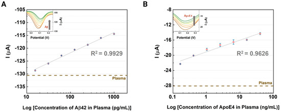 Differential pulse voltammetry was employed to detect various concentrations of Alzheimer’s disease biomarkers in buffer solutions. The assays were conducted with a scan rate of 100 mV/s, using a solution of 5 mM K3[Fe(CN)6] and 0.1 M KCl as the electrolyte. For each assay, concentration ranges were chosen based on the calibration curves used for ELISA laboratory tests: 15.63 to 100 pg/mL for Aβ42 and 0.41 to 40 ng/mL for ApoE4. Prior to electrical measurements, 10 µL of each AD-specific antibody (100 ng/mL) was immobilized on the sensing devices at room temperature for 1 h. Then, the phosphate-buffered saline (PBS) solutions spiked with the target analytes were introduced over the nanocomposites where the AD-specific antibodies were immobilized and the DPV curves were recorded. At least three devices were measured for a reproducibility assay. As shown in Figure 4, the cathodic peaks increased as the concentration of the amyloid peptides and ApoE4 increased. By investigating the correlation between the peak currents and the levels of AD-related biomarkers, we confirmed the linear responses shown in Figure 4, although the coefficients of determination (R2) for both biomarkers were 0.9709 for Aβ42 and 0.9841 for ApoE4. While these values indicate a strong correlation, they also suggest that accuracy and application may be limited due to potential saturation effects at high concentrations on the active surface of the electrode.