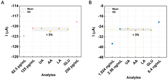 Interference assessment: Evaluation of the impact of various interfering compounds on the CNT-AuNS-PEG device. Differential pulse voltammetry (DPV) peak currents were measured for (A) amyloid-β 42 (circle) and (B) ApoE4 (rhombus), following the addition of interferents (triangle): 60 µM uric acid (UA), 10 µM ascorbic acid (AA), 50 mM lactic acid (LA), and 0.2 mM glucose (GLU) in plasma samples.