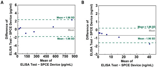 Validation analysis: Comparison between gold-standard ELISA laboratory tests and CNT-AuNS-PEG-based devices. Bland–Altman plots depict the level of agreement for measurements using diluted human plasma samples containing (A) Aβ42 and (B) ApoE4.