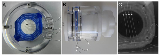 View of modified RatOx: (A) Top view. (B) Lateral view. (C) Axial Micro-CT scan. Hollow fiber mat bundle (+) with integrated sensor fibers (*).