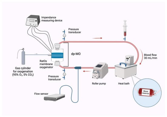 Schematic illustration of the experimental setup. dp-MO: pressure difference across the oxygenator. The syringe indicates the location of blood sampling; created with BioRender.com.