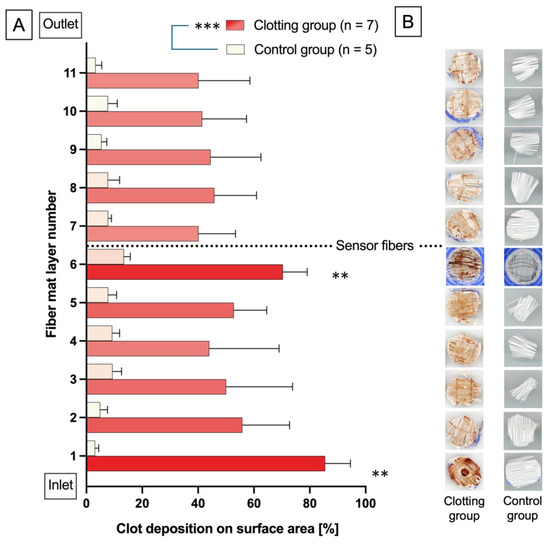 (A) The bar chart represents the share of hollow fiber mat area covered with blood clot residues for the clotting and control groups; the color contrast ranges from white (no/barely covered with blood clot deposits) to dark red (heavily covered with blood clot deposits) shown within the bars. Mean clot deposit on the hollow fiber mats surface is significantly higher in the clotting vs. control group and within the control group on hollow fiber mat No. 1 and 6 vs. every other hollow fiber mat in the control group. ANOVA: ** p < 0.002 vs. hollow fiber mat No. 2 to 5 and 7 to 11; *** p < 0.001 vs. control. (B) Exemplary scans of the hollow fiber mat layers 1–11, representative of the values shown in (A).
