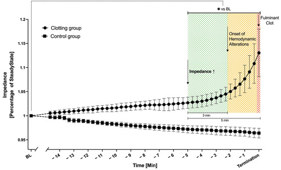 As differing durations until clot formation in each experiment led to varying endpoints, the time period 15 min before termination by fulminant clot formation was analyzed. The Anderson–Darling test was used to assess the normal distribution of impedance data. Impedance mean values of 30 s intervals within the 15 min period before fulminant clot formation were compared to baseline values, which were averaged from steady-state conditions (minute 20 to minute 15 before termination of the experiment).