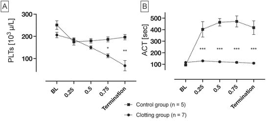 Platelet count (PLTs) and Activated Clotting Time (ACT) over the relative duration of the experiments. (A) PLTs in the clotting group (0.25 IU/mL; n = 7) decreased significantly compared to the those in the control group (5 IU/mL; n = 5). (B) In the control group, ACT increased significantly after initial heparinization, in comparison to the control group. All values within the respective quarter were cumulated and averaged. Mean ± SEM, ANOVA; * p < 0.05, ; ** p < 0.002; *** p < 0.001.