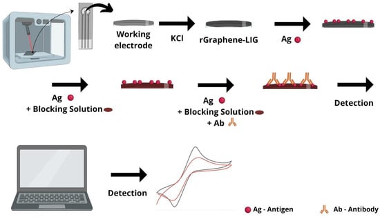 Schematic of rGraphene-LIG immunosensor. The manufacture of LIG electrodes was carried out using a device adapted to the Hypercube 3D printer. The steps for the preparation of the immunosensor were as follows. Electrochemical reduction in a KCl solution was conducted to improve the performance of the LIG electrodes. The rGraphene-LIG electrode was selected as the base platform; the SARS-CoV-2 antigen (Ag) was immobilized on the working electrode; the blocking solution was coupled to the platform; the antibodies (Ab—sample/real serum from the individuals) were coupled; and, at the end, the electroanalytical solution was inserted and the transduction process began.