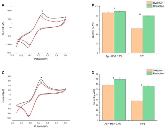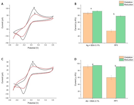 Graphic representing the initial value of the rGraphene-LIG immunosensor and the comparative methodology between (1) and (2) rGraphene-LIG diagnosis. (A,B) Cyclic voltammogram and column graph from (1) rGraphene-LIG indirect immunosensor extracted from cyclic voltammetry (CV) show the change in the current peak percentages (a) after the immobilization of the SARS-CoV-2 antigen (spike protein) followed by BS; (b) after the addition of sera from individuals with a known recent infection. (C,D) Cyclic voltammogram and column graph from (2) rGraphene-LIG immunosensor extracted from cyclic voltammetry (CV) show the change in the current peak percentages (a) after antibody immobilization (contained in the serum of an individual with a known recent infection) followed by BS; (b) after the addition of the SARS-CoV-2 antigen (spike protein). The percentages were calculated from the initial CV (without biomolecules), counted as 100%. The data denote oxidation in orange and reduction in green. The electrochemical signals of [Fe(CN)6]4−/[Fe(CN)6]3− were obtained at a scan rate of 100 mV s−1. PP1 = Positive Patient 1.