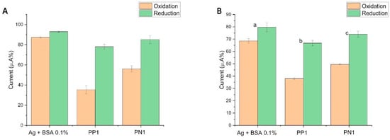 The percentages of oxidation and the reduction current were calculated from the initial CV (without the biomolecule), being considered as 100%.