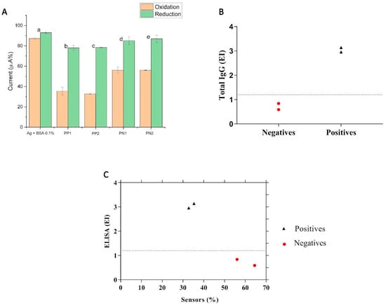 ELISA is commonly used to validate immunosensors, as it is a well-established technique in serological diagnoses. Thus, the results obtained with the developed biosensor (Figure 5A) were also confirmed by this technique (Figure 5B). Both techniques were in agreement (Figure 5C). However, in our experiments, we observed that the electrochemical immunosensor was able to demonstrate the presence of mild nonspecific interactions not identified in the ELISA; this can be explained by the good sensitivity of the biosensor when compared to other available techniques for the serological detection of patients and the initial “n” for the ELISA that was considered low for this analytical technique.