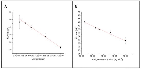 To evaluate the immunosensor’s sensitivity, an analytical curve with different dilutions of the serum from an individual positive for COVID-19 infection, containing anti-SARS-CoV-2 antibodies, was performed, namely pure serum, 1:300, 1:500, 1:1000, 1:1500, and 1:5000.