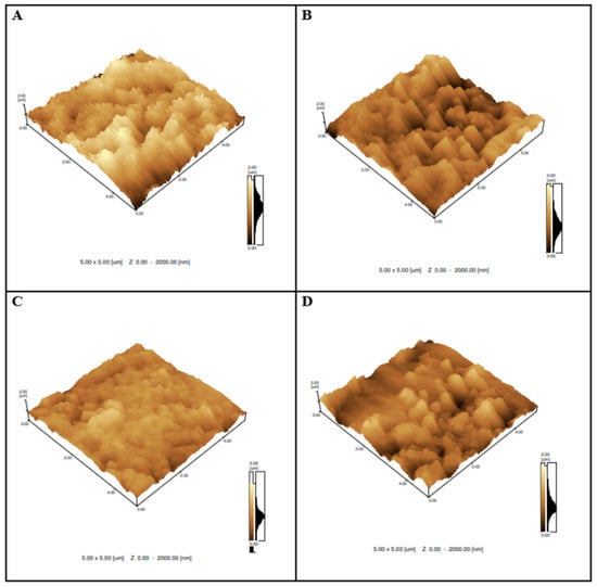 AFM images of (A) graphene; (B) graphene/RBD + BSA; (C) graphene/RBD + BSA/positive patient; and (D) graphene/RBD + BSA/negative patient. Roughness values obtained by AFM were 309 nm (bare graphene electrode), 235 nm (graphene/RBD + BSA), 166 nm (graphene/RBD + BSA/positive patient), and 220 nm (graphene/RBD + BSA/negative patient).