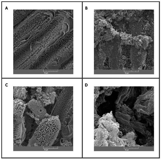 Scanning electron micrographs (SEM) of graphene electrodes modified with different biomolecules in (A) graphene; (B) graphene/RBD + BSA; (C) graphene/RBD + BSA/positive patient; and (D) graphene/RBD + BSA/negative patient. The images reveal the surface morphologies of the electrodes, highlighting the presence of porous and rough structures characteristic of graphene, as well as the interaction of the biomolecules with the electrode surface. Scale: 10 µm.