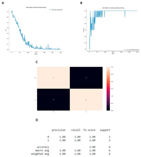 The rigor of the developed method was evaluated through error calculation (Figure 9A). Results with indices close to zero on the “y-axis”, as demonstrated in this work, are related to greater efficiency in dealing with the data presented. To assess the accuracy of the method developed, an analysis chart was generated (Figure 9B), so that results close to 1 on the “y-axis”, as presented in this work, indicate a higher rate of correct answers in the process of creating the training model.