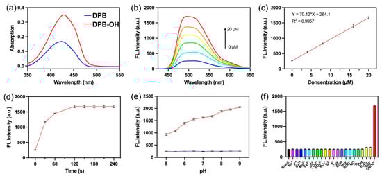 Spectral response behaviors of the DPB probe toward ONOO− in the PBS-CH3CN buffer solution (10 mM, 5:5, v/v, pH = 7.4). (a) UV-vis and (b) fluorescence spectrums of DPB in the absence and presence of ONOO− (0–50 μM) (λex = 405 nm). (c) Plots of the linear relationship between the fluorescence intensities at 500 nm and the concentration of ONOO−. (d) Time- and (e) pH-dependent fluorescence intensity of DPB at 500 nm after the treatment of ONOO− (20 μM). (f) Fluorescence intensity of DPB at 500 nm in the presence of several interference analytes (1.0 mM).