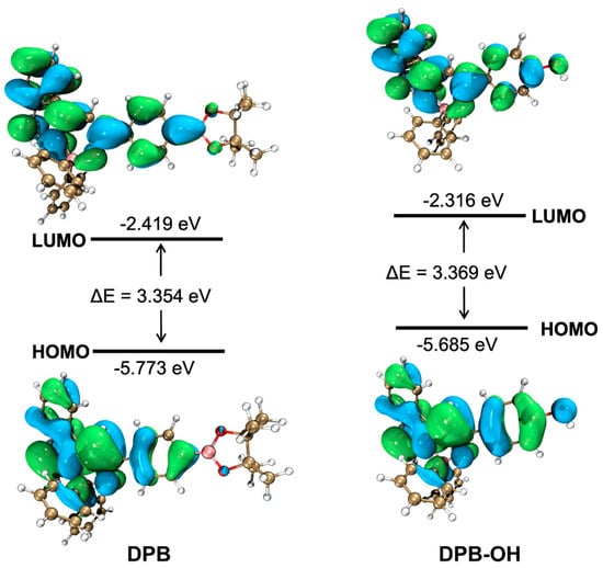Density functional theory (DFT) calculations were employed to optimize the geometry of both DPB and DPB-OH, and to compute their corresponding highest occupied molecular orbitals (HOMO) and lowest unoccupied molecular orbitals (LUMO) (Figure 2). The HOMO-LUMO gap of DPB-OH (ΔE = 3.369 eV), which contains a phenolic hydroxyl group in place of a pinacolphenylboronate group, was higher than that of DPB (ΔE = 3.354 eV), explaining a slight bathochromic shift in the maximum absorption observed upon treatment of DPB with ONOO−.