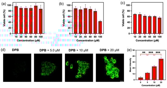 Cytotoxicity assay of different concentrations of DPB on (a) HCT116, (b) A549, and (c) HepG-2. (d) Colocalization imaging of ONOO− in HCT116 cells with the DPB probe. After pretreatment with the DPB probe (10 μM) for 15 min, the HCT116 cells were incubated with different concentrations of ONOO− for 30 min. (e) Statistical results of the corresponding fluorescence intensity of (d). p-values are calculated using one-way ANOVA with Bonferroni correction, ** p < 0.01, *** p < 0.001. Scale bar is 20 μm.