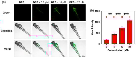 (a) Fluorescence imaging of ONOO− with DPB (10 μM) in zebrafish (After pretreatment with DPB for 15 min, the zebrafish were further incubated with different concentrations of ONOO− for 30 min). (b) Statistical results of the corresponding fluorescence intensity of (a). p-values are calculated using one-way ANOVA with Bonferroni correction, ** p < 0.01, *** p < 0.001. Scale bar is 500 μm.