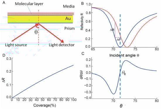Stratified medium model for surface plasmon resonance (SPR). (A) Schematic of the stratified medium model; (B) SPR reflectivity curves without (blue) and with (red) a 10 nm polystyrene film; (C) slope of the reflectivity curve; (D) reflectivity changes with varying coverage of 5 nm protein molecules [15].