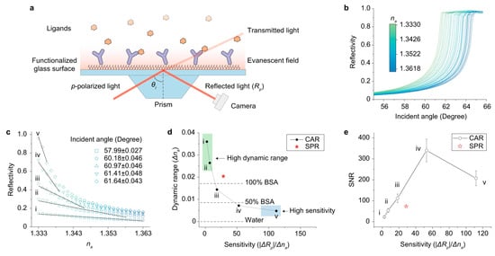 TIR-CAR biosensors. (a) Experimental setup and surface chemistry. (b) Measured reflectivity change as a function of incident angle. (c) Reflectivity as a function of sample refractive index at five representative incident angles (i–v). (d) TIR sensor sensitivity and dynamic range at the five representative angles in (c). (e) Signal-to-noise ratio comparison for SPR and TIR at the five representative angles in (c) [40].