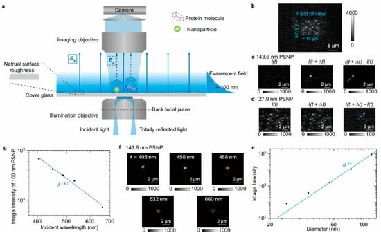 TIR-ESM biosensors for label-free single-protein imaging. (a) Optical setup schematic. (b) Raw image of a bare cover glass. (c,d) Images before and after binding of nanoparticles. (e) Image intensity versus particle diameter. (f) Images of nanoparticles with different incident wavelengths. (g) Image intensity versus incident wavelength [44].