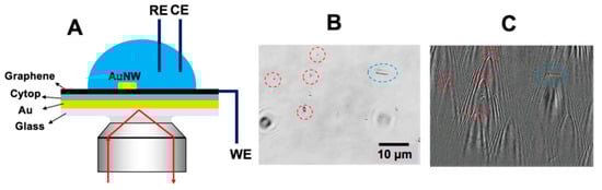 Surface charge distribution biosensors. (A) Experimental setup with a gold film coated with a Cytop dielectric layer and a graphene conductive layer. (B,C) Transmitted and SPR images of gold nanowires (1-μm AuNWs (red circled) and a 6-μm AuNW (blue circled)) [47].
