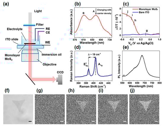 Optical imaging of local charge distributions using monolayer MoS2. (a) Schematic illustration of the setup. (b) Absorption spectrum of monolayer MoS2. (c) Transmission change as a function of gate voltage. (d) Raman spectrum of monolayer MoS2. (e) Photoluminescence spectrum. (f) Optical transmission image. (g–j) Differential images at various gate voltages. Scale bars: 5 μm [49].