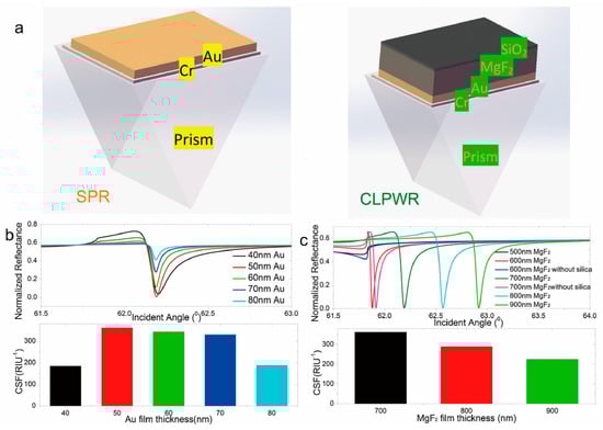 Optical waveguide biosensor. (a) Schematics of SPR and optical waveguide modules. (b) Calculated reflectance spectra and sensitivity factors with different Au film thicknesses. (c) Calculated reflectance spectra and sensitivity factors with different MgF2 film thicknesses [54].