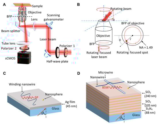 BSW biosensors. (A) Experimental setup. (B) System illumination configuration. (C,D) Substrates for SPR and BSW, respectively [61].