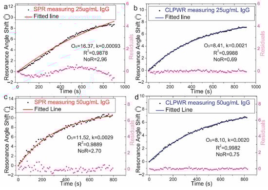 Optical waveguide biosensors detecting IgG binding. (a–d) Time course and fitting results for different IgG concentrations with the pink dots representing the residuals of the fit [54].