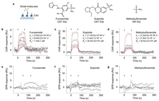 TIR-CAR biosensor measuring small molecule ligands binding to carbonic anhydrase II. (a) Immobilization of CAII on glass and gold surfaces. (b–d) CAR response curves for different ligands (black curves) and fitted results (red curves) interactions measured with SPR (the beginning and ending of binding phase is marked with arrow).(e–g) same interactions were measured wth SPR but no clear response was observed. The CAII surface coverages were 6.5% and 5.8% for the gold and the glass surfaces, respectively(the beginning and ending of binding phase is marked with arrow) [40].