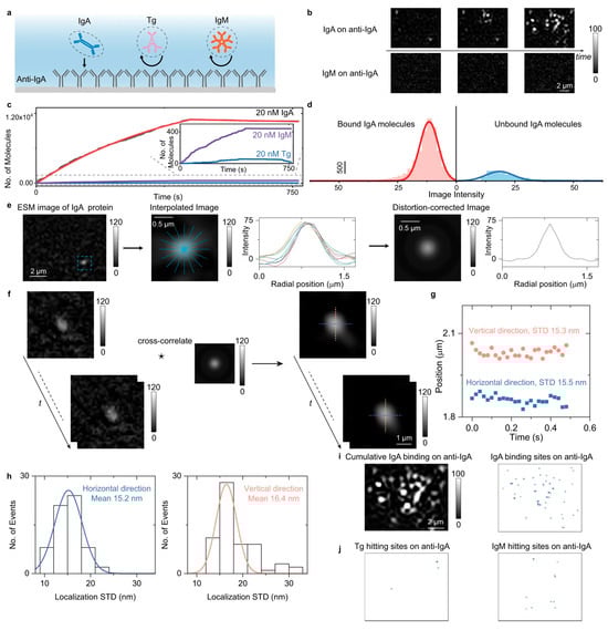 Digital counting of protein binding process with TIR-ESM. (a) Schematic of single-protein behaviors on modified surfaces. (b) ESM images of IgA binding and negative control. (c) Kinetics of IgA binding by digital counting. (d) Image intensity histogram. (e) Mean radial profiles for PSF construction. (f) Correcting ESM image distortions. (g) Tracking protein binding position. (h) Localization standard deviations. (i) Super-resolution image of IgA binding events. (j) Super-resolution image of Tg and IgM hitting events [40].