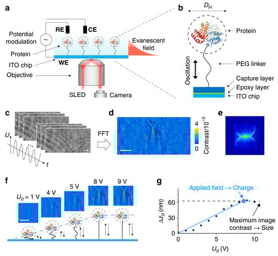 The evanescent field’s exponential decay characteristic significantly enhances the resolution along the z-axis perpendicular to the surface in surface-wave-based techniques, enabling the precise determination of a scatterer’s position along the z-axis based on its scattering intensity. Leveraging this attribute, nano-oscillators driven by electric field can be intricately engineered to measure the weight or charge of single-protein molecules utilizing an entropic elasticity model. Surface-sensitive biosensors with dielectric surfaces, such as TIR biosensors, offer minimal background Faraday signals in the electric field, facilitating higher contrast detection compared to SPR biosensors [70,71]. As illustrated in Figure 12, TIR biosensors can assess the oscillations of single proteins anchored to an ITO surface through polyethylene glycol (PEG) linkers, driven by an alternating electric field [70]. This setup enables the precise imaging of single-protein molecules oscillating in response to the field, thereby elucidating both the molecular size and charge. The scattering signal is analyzed using a fast Fourier Transform (FFT), which permits the accurate quantification of mechanical properties such as oscillation amplitude, size, and charge at the single-molecule level. This real-time detection technique offers unparalleled detail in the analysis of single-molecule protein dynamics, proving especially valuable for exploring molecular interactions and conformational changes.