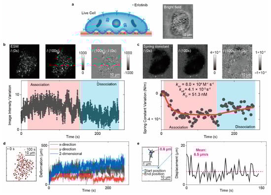 The study in Figure 13 uses TIR-ESM for the in situ analysis of the binding kinetics of erlotinib, a small molecule inhibitor, to the epidermal growth factor receptor (EGFR) on live A431 cells [72]. This setup not only tracks the binding events in real time but also allows for the simultaneous extraction of multiple parameters such as binding kinetics parameters and equilibrium constants. Moreover, the high z-axis resolution of the TIR biosensors plays a critical role in measuring the subtle movements of protein–ligand complexes, enabling the calculation of elasticity coefficients (spring constants) of the molecular bonds. Through this, TIR-ESM provides valuable insights into the mechanical properties of the interactions, such as the stiffness and tension of the membrane protein complexes.