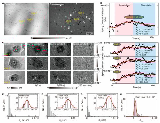 High-throughput single-cell analysis of membrane protein interactions. (A) Bright field image and spring constant map of live A431 cells. (B) Spring constant variation over time. (C) Zoomed views of cell regions at different times. (D) Spring constant variation from a marked cell. (E–H) Statistical distributions of binding parameters [73].