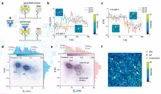 Identification of single proteins in a mixture. (a) IgA and BSA mixed and tethered to the surface. (b,c) Real-time monitoring of size and charge changes in IgA upon antibody binding. (d,e) Two-dimensional size and charge distribution before and after adding anti-IgA. (f) Example of identified IgA and BSA molecules [71].