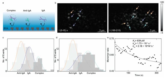 ESM detection of anti-IgA and IgA interactions. (a) Schematic of nonspecific bindings. (b) Protein (anti-IgA: orange arrow, IgA: purple arrow, and the complex: light green arrow) binding images at different times. (c,d) Histograms of protein counts over time and the fitted distribution curves with corresponding color in (b). (e) IgA monomer ratio as a function of time [74].