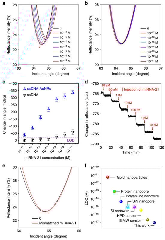 Ultra-sensitive detection of miRNA-21 using an antimonene SPR sensor. (a) SPR spectra with varying miRNA-21 concentrations. (b) Relationship between SPR angle and miRNA concentration. (c) Real-time SPR response of ssDNA-AuNR desorption. (d) SPR curve change with one mismatched nucleobase. (e) Comparison of detection limits. (f) Comparison of the LOD of the antimonene miRNA SPR sensor with that of state-of-the-art sensors [48].