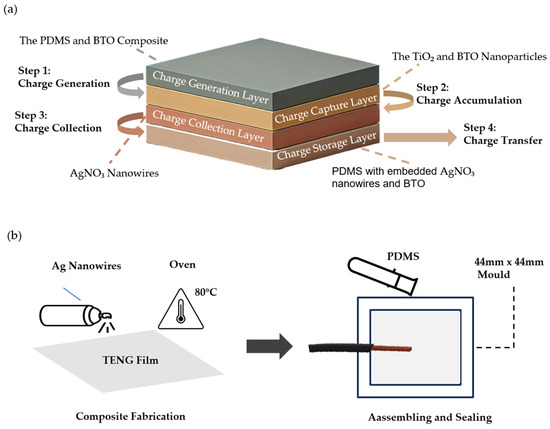 (a) Schematic diagram showing the charge generation, capture, collection, and storage processes of the composite multi-material triboelectric nanogenerator (TENG) used in this study, forming a complete energy cycle. (b) Composite fabrication: Spin-coated Ag nanowires on TENG film, cured at 80 °C for 20 min. Assembly and sealing: The composite and a conducting wire were placed in a box and sealed with PDMS. TENG sensor prototype: Length of 44 mm, width of 44 mm, height of 2 mm.