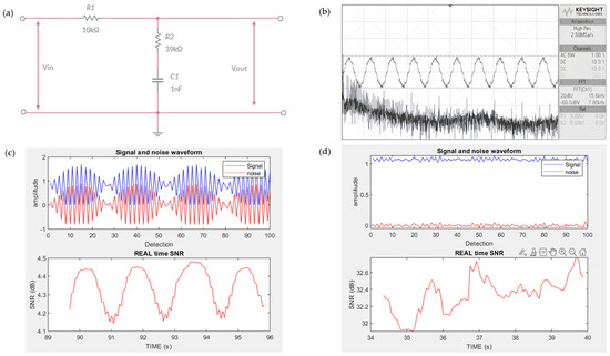 Figure 3a shows the RC circuit schematic diagram. After implementing the filter, the signal quality was verified using MATLAB to compare the signal-to-noise ratio (SNR) before and after the RC circuit was applied [19]. As shown in Figure 3c,d, the SNR increased from approximately 4.3 to 32.5, indicating a significant improvement in signal clarity because the signal was much stronger relative to the noise. This enhanced signal quality made it easier for signal processing algorithms to analyze the data, thus improving the overall system performance.