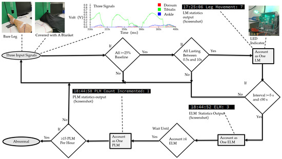 The logic flow of signal processing and judgment for PLMS detection. At the beginning of the test, the input signals from three synchronized sensors were recorded under various conditions (such as bare legs, covered with a blanket, one foot resting on the other, and rotating the foot left and right). Each movement was maintained for 1 s, and 10 trials were carried out to compute the mean value, with an error margin of 0.1 V. The baseline voltage was established at 0.15 V, and a threshold was set at 25% above the baseline, which is equal to 0.1875 V [5]. To visually represent the results, the graphs were plotted using the mean values of the signals, as displayed in Section 3. When all three sensors detected valid muscle activity lasting between 0.5 and 10 s simultaneously, the system classified this as a valid LM. If two consecutive LMs occurred with an interval between 5 and 90 s, this was considered a valid ELM. Once four ELMs were detected, it was classified as a PLMS. The system further monitored the occurrence of PLMS over a one-hour period. If 15 or more PLMS were detected, it was considered abnormal.